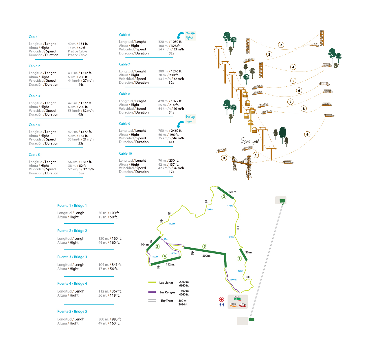 Contamos con cinco puentes modernos, el más largo abarca unos 300 metros. Los senderos se extienden por poco más de dos kilómetros (2.5 km).